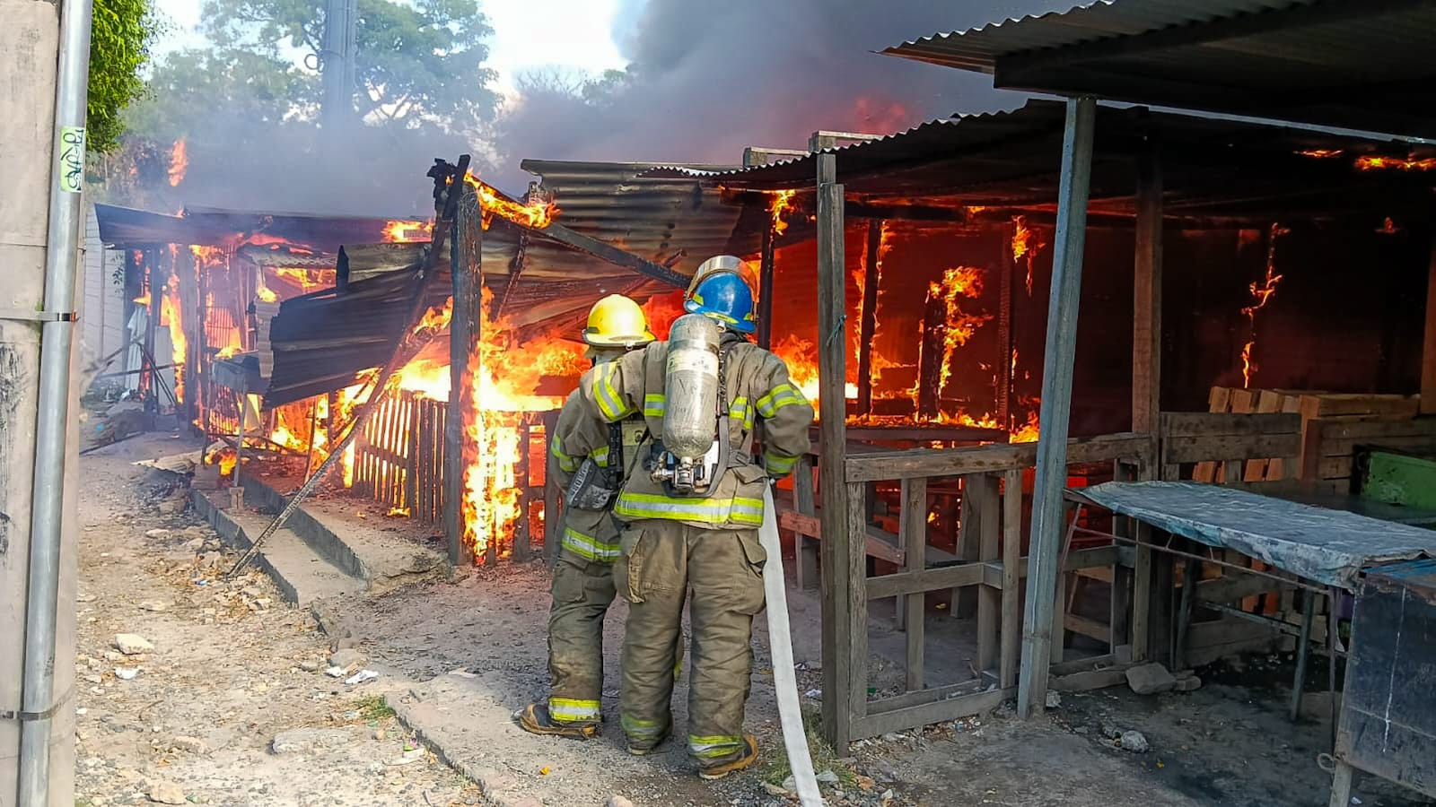 El equipo del Cuerpo de Bomberos de El Salvador informó que fue sofocado un incendio estructural registrado en varios locales utilizados para la venta de alimentos, construidos con lámina y madera.