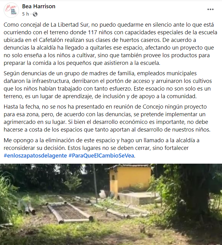 Madres de familia y ciudadanos denunciaron la destrucción de un terreno utilizado por niños con capacidades especiales de una escuela ubicada en El Cafetalón, La Libertad, donde llevaban a cabo un proyecto de huertos caseros. Según las denuncias, la alcaldía de La Libertad Sur ha intervenido el terreno, afectando gravemente un proyecto que no solo enseñaba a los niños a cultivar, sino que también proveía alimentos para las comidas que se preparaban en la escuela.
