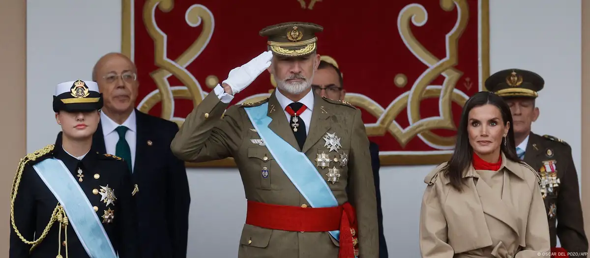 La parada militar del Día de la Fiesta Nacional, que presiden los reyes Felipe VI y Letizia, ha comenzado este sábado pasadas las 11:00 horas en la Plaza de Neptuno de Madrid, donde está instalada la tribuna real y la de autoridades, en un acto deslucido por la lluvia, que ha obligado a suspender el desfile aéreo.