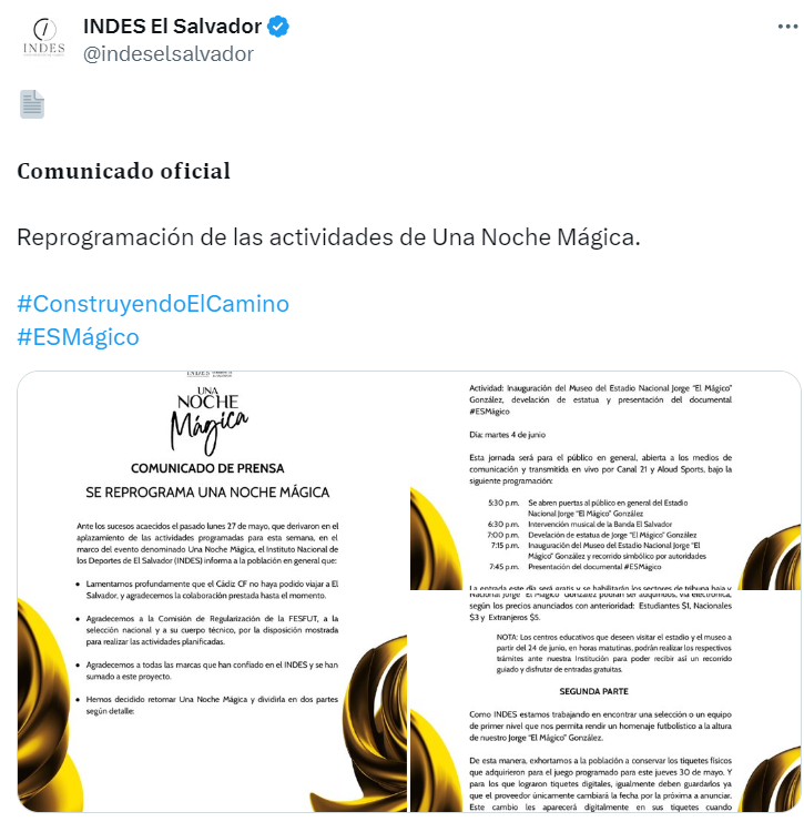 El Instituto Nacional de los Deportes (INDES) de El Salvador anunció la reprogramación de la tan esperada «Noche Mágica», un evento que celebra la vida y la carrera del legendario futbolista salvadoreño Jorge «El Mágico» González. Esta ceremonia se dividirá en dos partes, con la primera fase programada para el próximo martes 4 de junio.