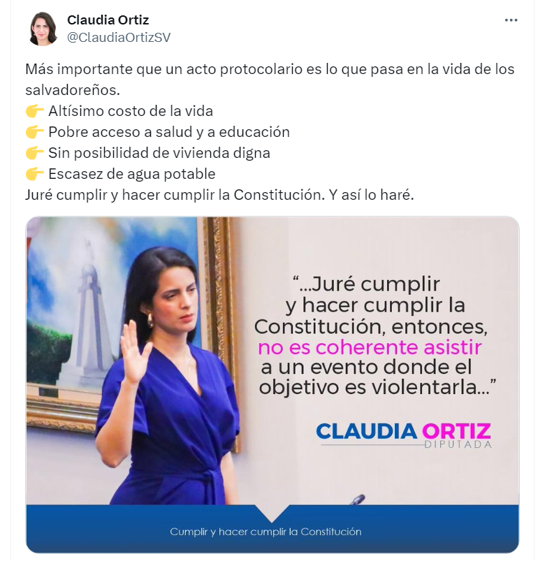 La diputada Claudia Ortiz, del partido Vamos, fundamentó su decisión en la coherencia con el respeto a la Constitución de la República, subrayando la violación constitucional que representaría la reelección presidencial inmediata, prohibida por la Carta Magna.