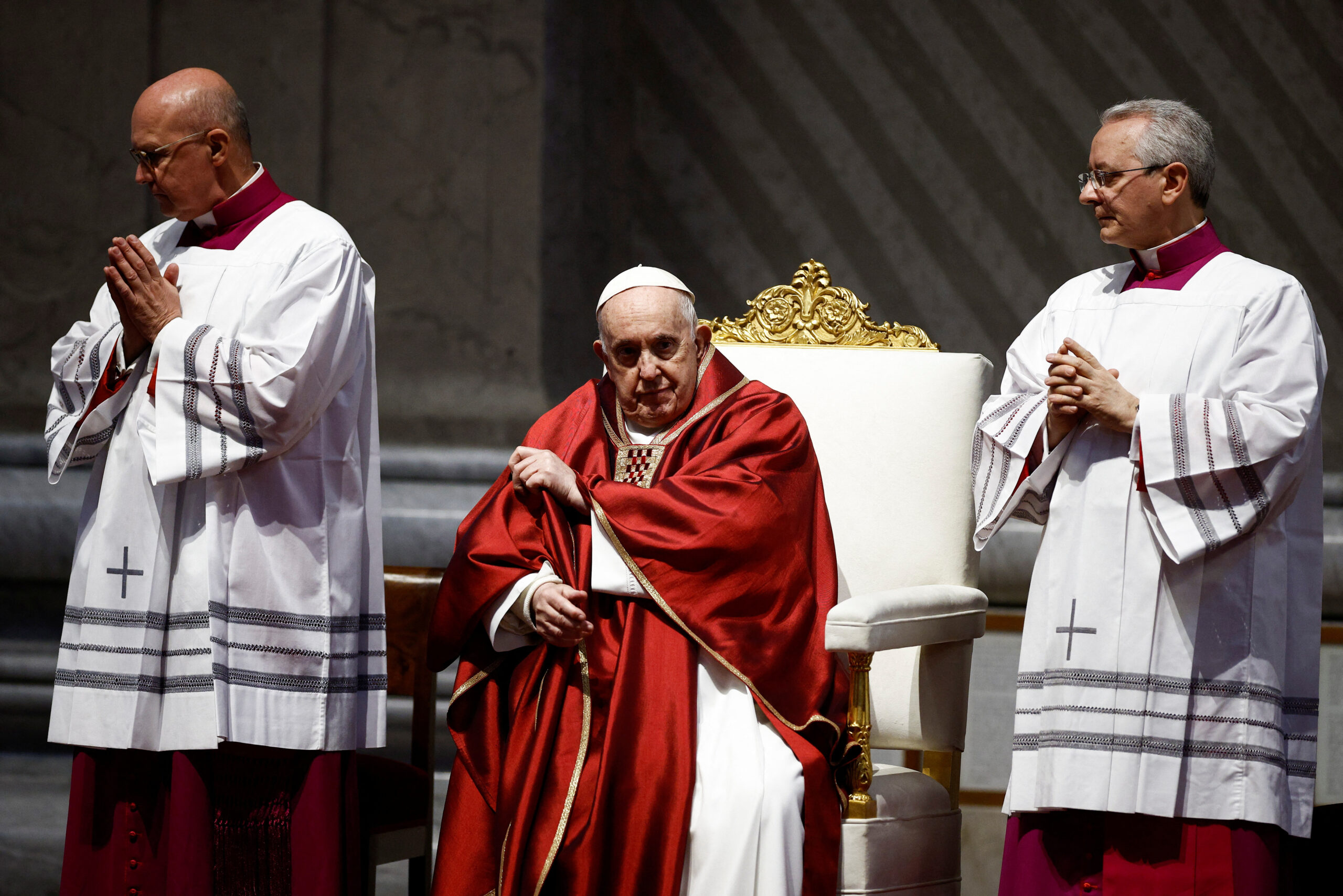 Francisco, que salió del hospital Gemelli tras permanecer ingresado tres días por una bronquitis, apareció en buena forma y presidió la misa en un lado del altar como estaba establecido debido a sus problemas en la rodilla que le impiden estar mucho tiempo de pie.