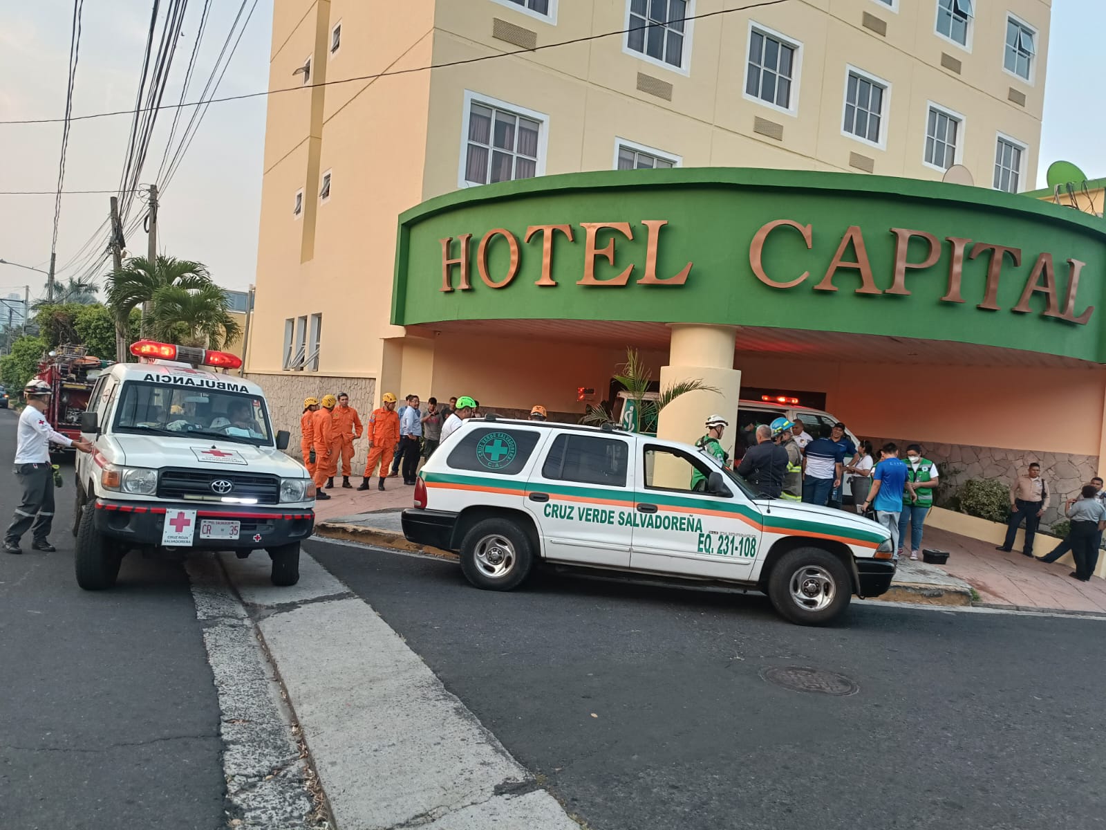 ???? Hotel Capital, Antiguo Cuscatlán✅ Equipo de Cruz Verde Santa Anita y Antiguo Cuscatlán junto a instituciones de socorro se hicieron presente para realizar labores de rescate, siendo rescatas aproximadamente 9 personas. pic.twitter.com/Iy5XlQenYA