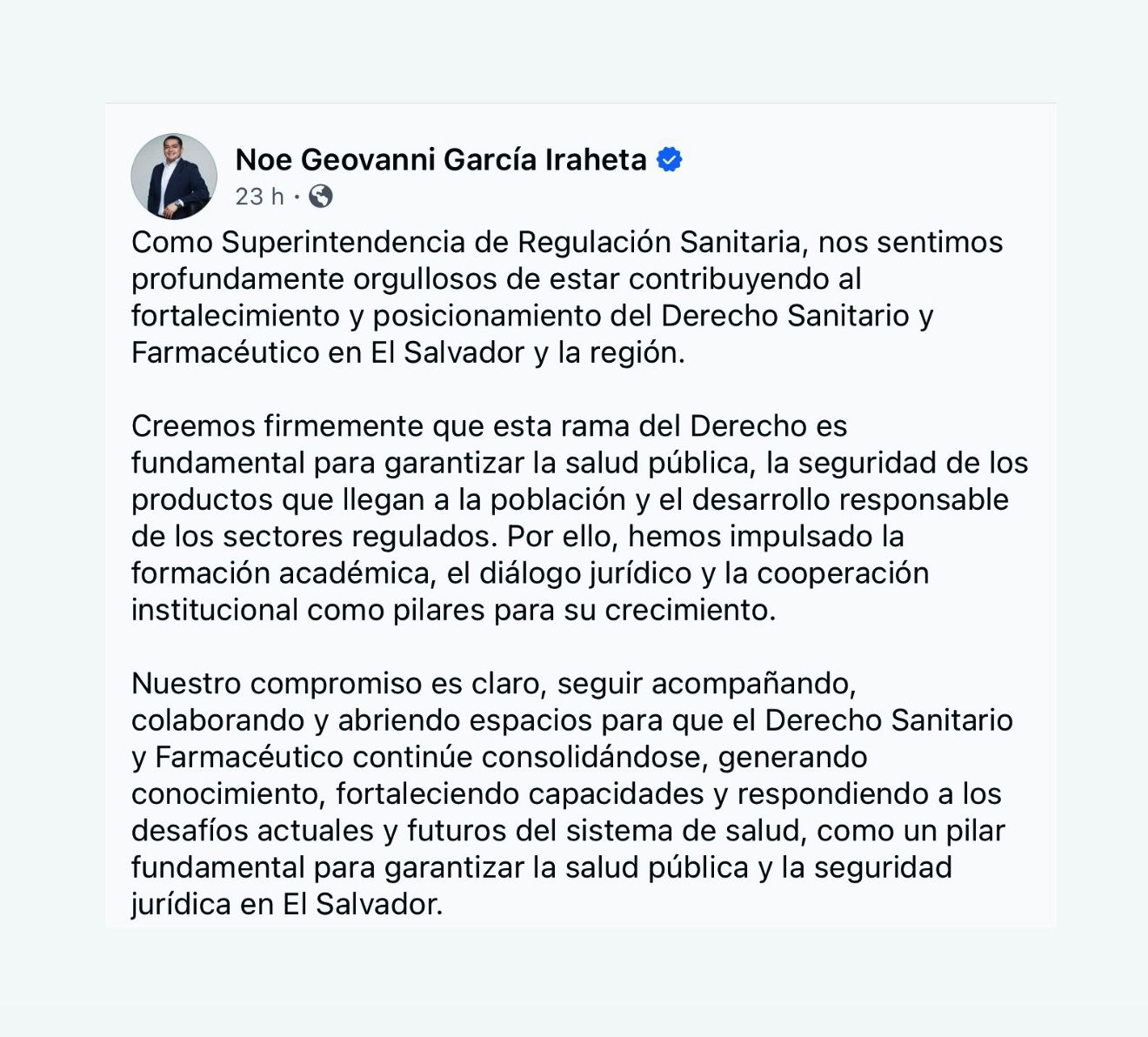 El titular de la Superintendencia de Regulación Sanitaria (SRS), Noé Geovanni García, informó que la institución continúa contribuyendo al fortalecimiento y posicionamiento del Derecho Sanitario y Farmacéutico en El Salvador, como parte de sus esfuerzos por consolidar un marco jurídico sólido que respalde la protección de la salud pública y la regulación de los sectores vinculados.